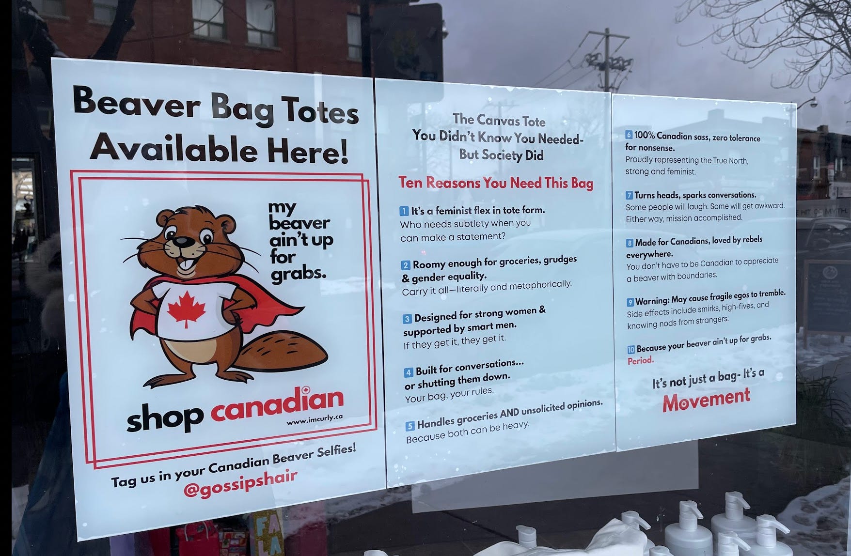 Some sort of amalgam of various moments’ progressivisms is in place at this not-quite-local business, with nods to Trump’s “pussy” remark of 1812, and more recent threatened invasions of Canada, but also, somehow, the spirit of a feminist blog that might have existed in 2007. Conveniently, I’m set for tote bags, thanks, so I can refrain from partaking w…